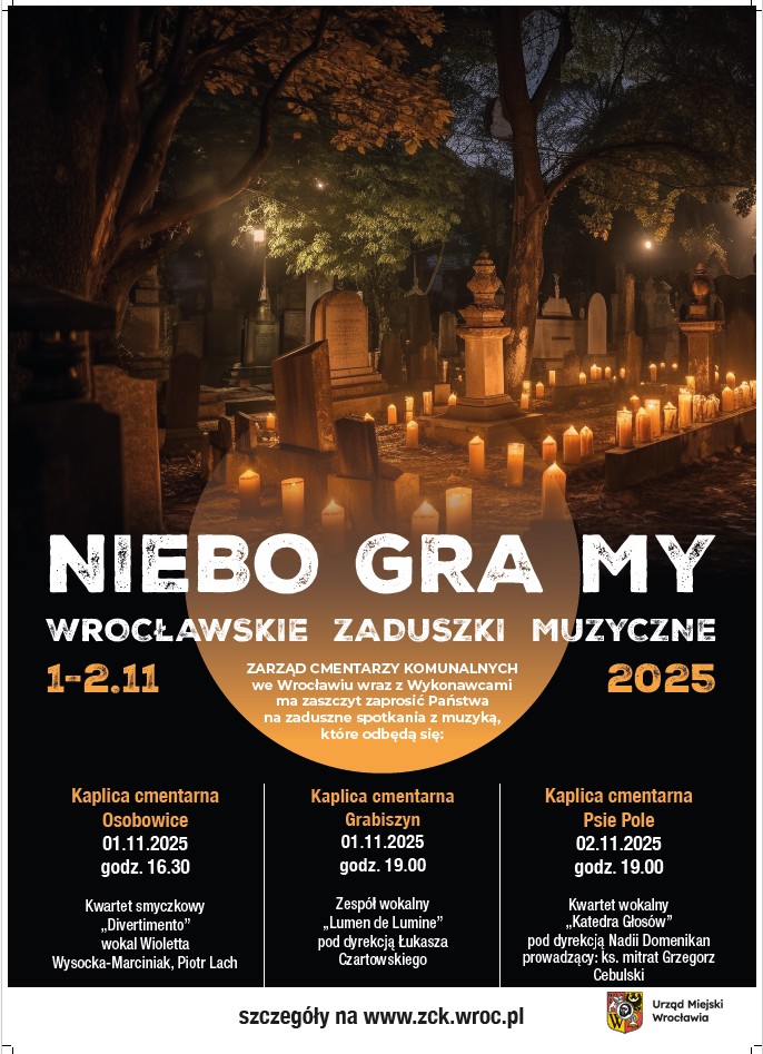 Zarząd Cmentarzy Komunalnych we Wrocławiu wraz z Wykonawcami zaprasza Państwa na zaduszkowe spotkania muzyczne, które odbędą się w dniach 01-02 listopada 2025 r., w kaplicach cmentarnych na Osobowicach, Grabiszynie i Psim Polu. Pragniemy wprowadzić Państwa w refleksyjną atmosferę, którą przyniesie duchowe ukojenie. Nasza inicjatywa, podjęta w ubiegłym roku spotkała się z dużą aprobatą słuchaczy, stąd ponownie zgromadzono zespoły, które z radością podzielą się z nami swoim talentem, dzięki czemu będziemy mogli głębiej, duchowo i nie w samotności przeżywać czas wspomnień i refleksji.